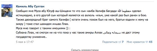 Abu Sultan did not mention the issue of suicide-bomber corruption, however, in a recent post on the Russian social-networking site VKontakte, where he said that the son of Baghdadi's second-in-command had carried out a suicide bombing and that Baghdadi's own brother had "become a martyr."