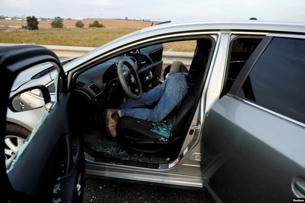 A man and woman lie dead in a car in the Sderot area of southern Israel on October 7, 2023, following the deadly attack by Hamas gunmen.
