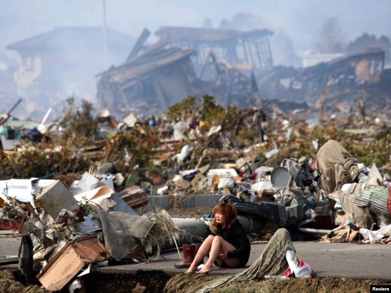 A woman cries while sitting on a road amid the destroyed city of Natori, Miyagi Prefecture, on March 13.