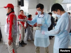 Technicians scan Red Cross rescue workers for signs of radiation in Nagahama City, Shiga Prefecture, on March 14.