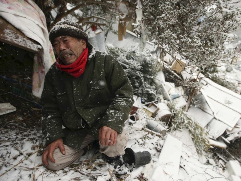 A man cries next to his destroyed house, where his dead mother is still buried in the rubble, in Onagawa town in Miyagi Prefecture on May 17.