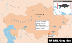 The clashes, which erupted overnight on February 8, were some of the worst ethnic violence in years in the Zhambyl region, located about 130 kilometers west of Kazakhstan's commercial capital, Almaty.