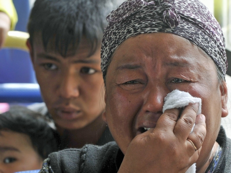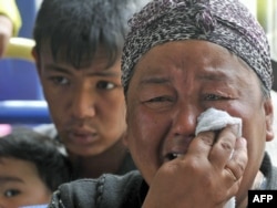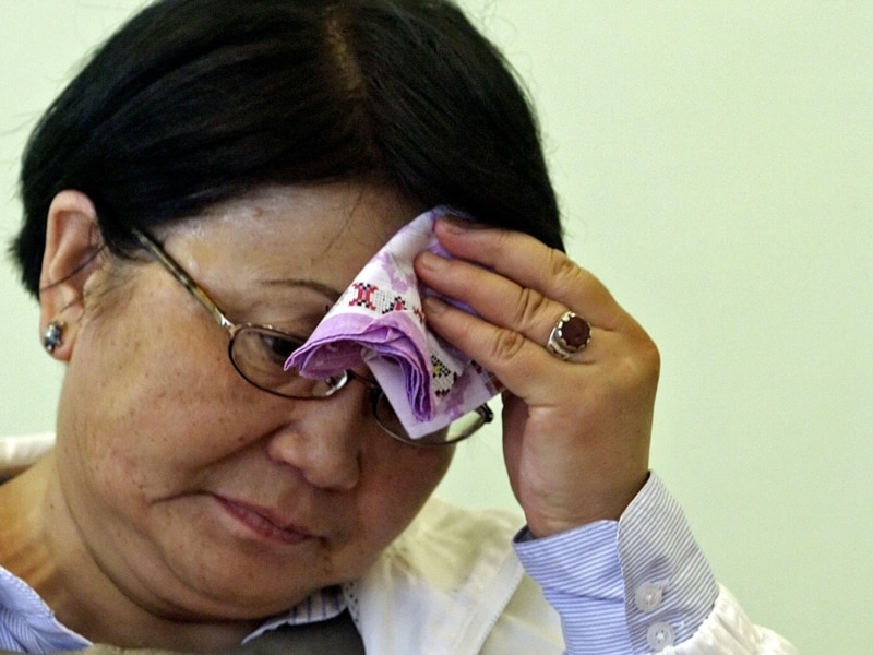 An ethnic Uzbek woman cries as she rides on a bus as it leaves Osh on June 15, 2010. Uzbekistan had closed its border to refugees fleeing the deadly violence.