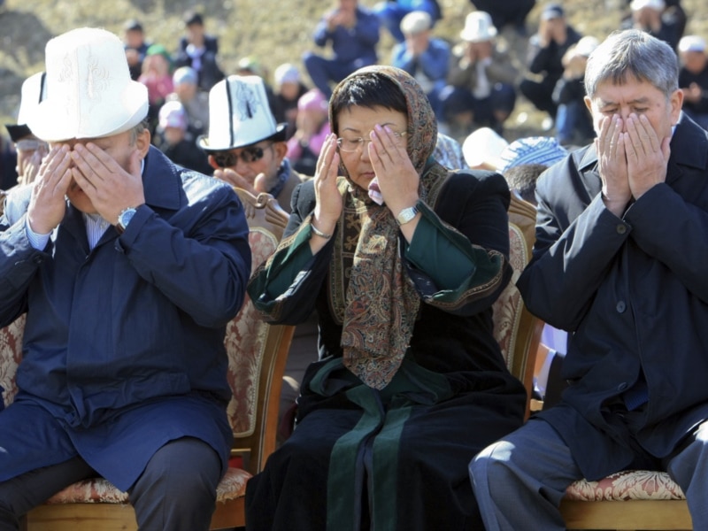 President Roza Otunbaeva (center), Prime Minister Almazbek Atambaev (right), and parliament speaker Ahmatbek Keldibekov pray at a cemetery in the village of Chon-Aryk.