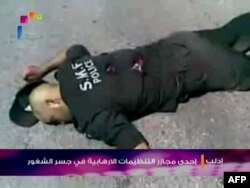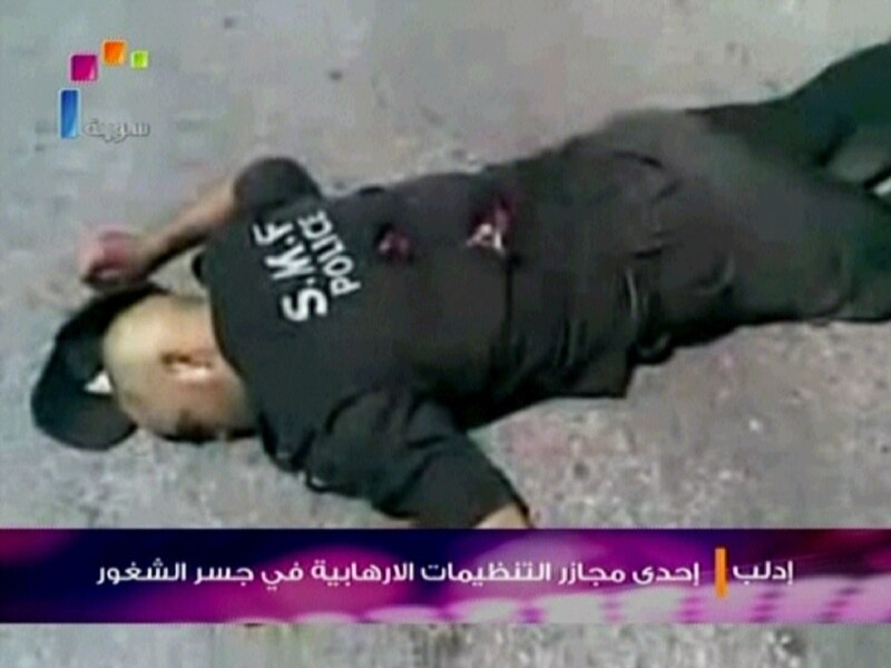 A screen grab shows what Syrian state TV said were police officers shot dead by "armed gangs" during a massacre in the town of Jisr al-Shughour.