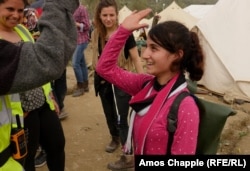 Raida Matar, a 13-year-old Yazidi refugee from Sinjar in Iraq, sits with a Spanish volunteer on a green tarp spread out on the rough dirt between tent stakes. Matar doesn't understand the English directions but learns by watching how to punch holes in forest-green boat fabric and to fasten the seams together with rivets. Finally, she attaches black life-vest straps to the bag and slips the finished product over her slight shoulders.
