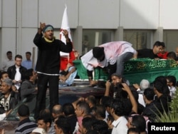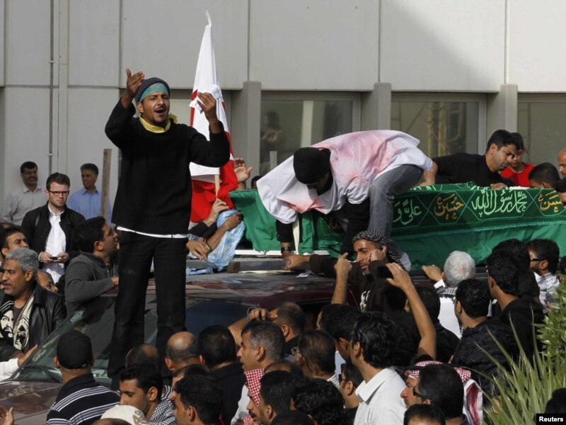 Family members and supporters of Fadel al-Matrook, a protester who was killed during police clashes, carry his coffin from the mortuary for a funeral in Manama today.