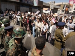 Yemeni security forces block antigovernment protesters from advancing during demonstrations on February 15.