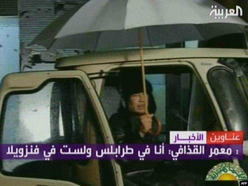 Qaddafi had appeared briefly on state television on the night of February 21 amid rumors he had fled to Venezuela. He was shown in a strange pose, sitting in a military vehicle with the door open and holding an umbrella over his head.