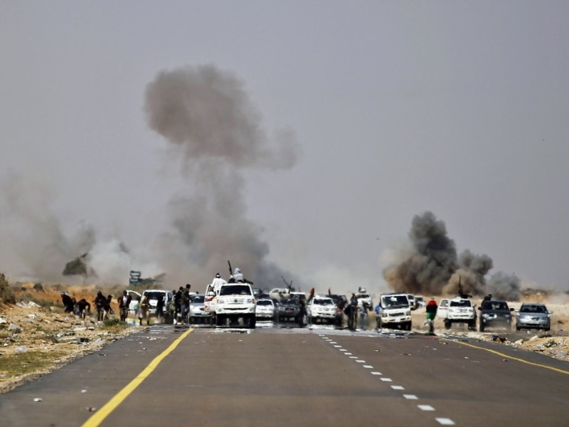 Shells explode near a column of rebel vehicles near Bin Jawad on March 29.