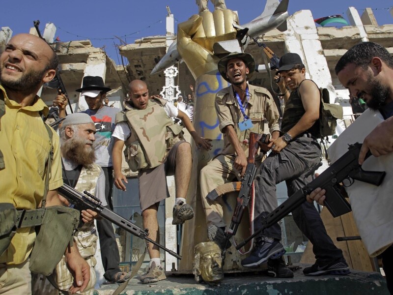 Rebel fighters gesture as they stamp on a part of a statue of Muammar Qaddafi inside the main compound in Bab al-Aziziya in Tripoli on August 23.