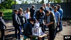 A man casts his ballot along with a dozen or so others in the village of Ternove near Luhansk. There doesn't appear to be any privacy in the vote-casting. No voting booths or curtains to hide behind.