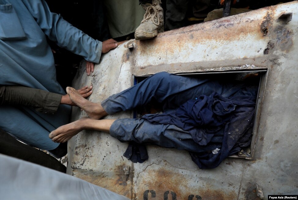 The body of a victim is seen trapped in a damaged vehicle.