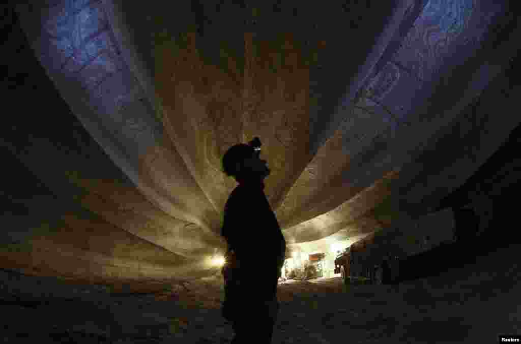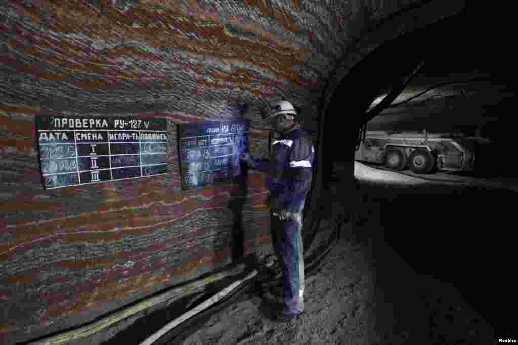 An employee checks an underground store of potassium salts at a Uralkali potash mine. The company's mines draw on the Verkhnakamskoe deposit in the Ural Mountains, one of the largest deposits in the world.