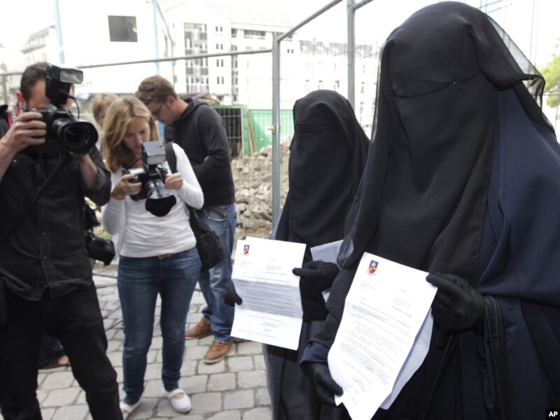 Two Belgian sisters, who were each fined 50 euros in August for wearing the full veil in public, show their citations to journalists outside the town hall in Brussels.