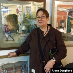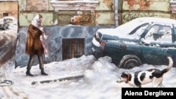 Dergileva told RFE/RL she works by finding somewhere discreet on the street to stand, then makes a quick sketch of the scene on an oven-tray-sized sheet of her favorite French art paper.