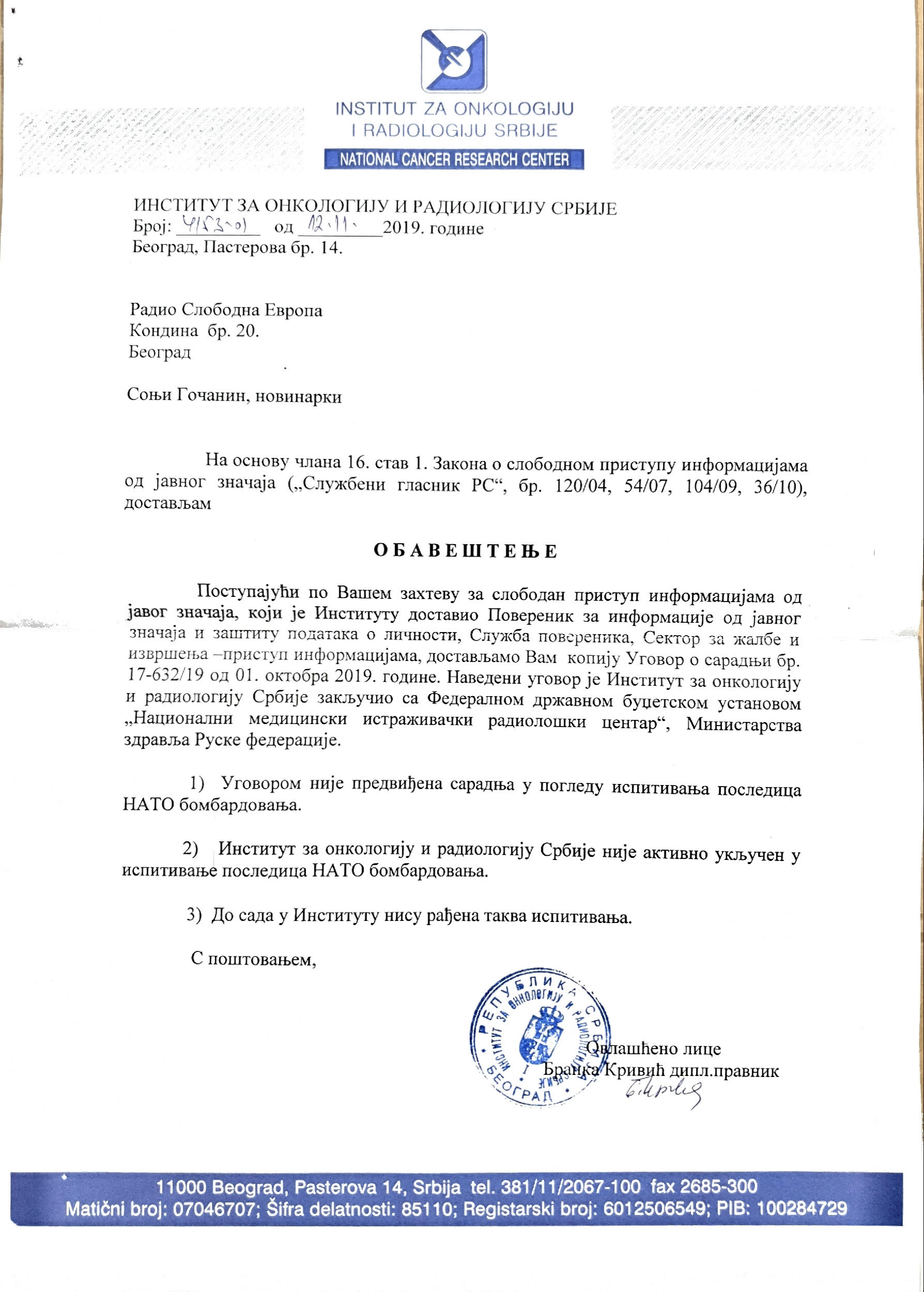 The contradiction surfaced after Serbia's state-run Institute of Oncology and Radiology inked a deal with its Russian counterpart in September on closer cooperation in research and other activities.