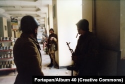 The above photo, of a Romanian soldier during a gun battle on the streets of Timisoara in December 1989, is one of several anonymous images recently posted online by the Hungarian photo archive Fortepan.