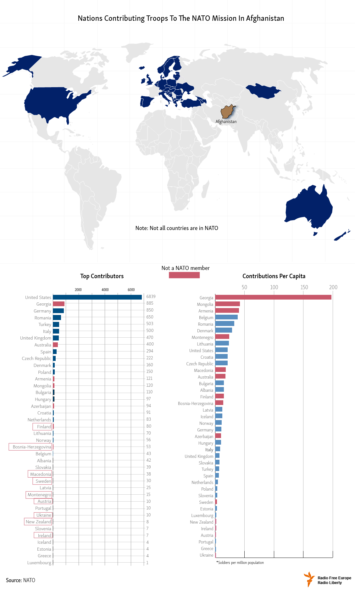 With about 880 soldiers currently serving in NATO's Resolute Support Mission in Afghanistan, Georgia is making the second-largest contribution after the United States. Here's a breakdown of all of the nations that are making contributions to the NATO mission there.