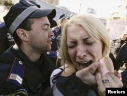 Police detain a Femen activist during a protest in downtown Kyiv in April.