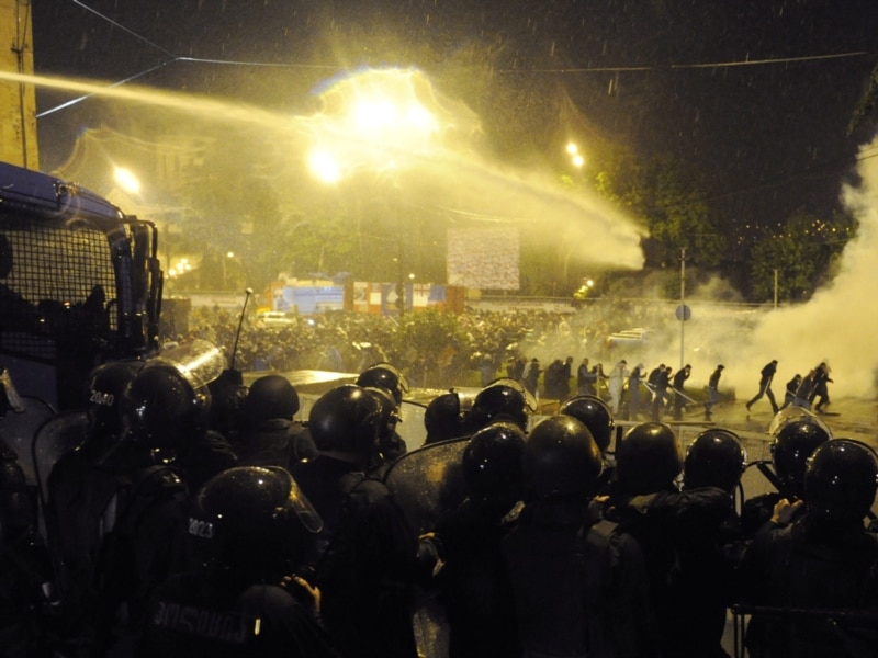 Five days of opposition protests in Georgia came to a violent end overnight as riot police used tear gas, water cannon, and rubber bullets to disperse demonstrators.