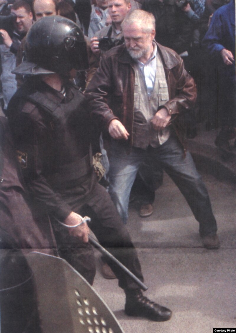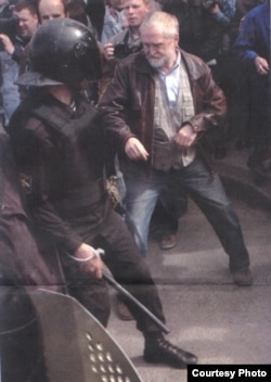 Another photograph, this one from 2007, shows dozens of Interior Ministry troops wielding shields and batons as they chase an unarmed Rybakov down the road. His crime? He had been taking part in an opposition protest. The troops eventually abandoned their pursuit to deal with more serious incidents elsewhere.