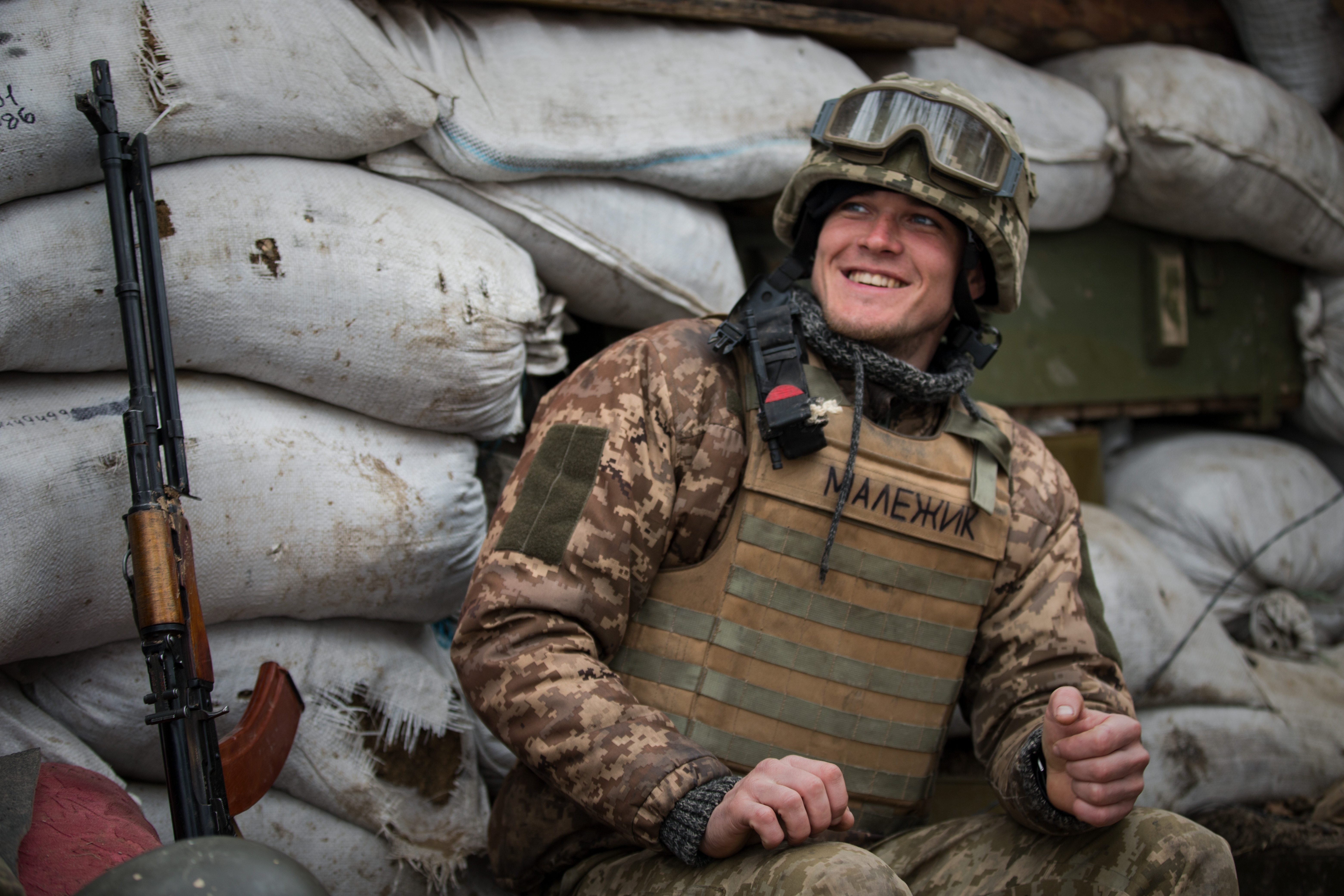 A Ukrainian Marine nicknamed “Malezhik” in a fortified position just 200 meters from enemy lines. A few months after this picture was taken, the young fighter was wounded by fragments from an exploding grenade. After recuperating in a military hospital, he is now back on the fighting front.