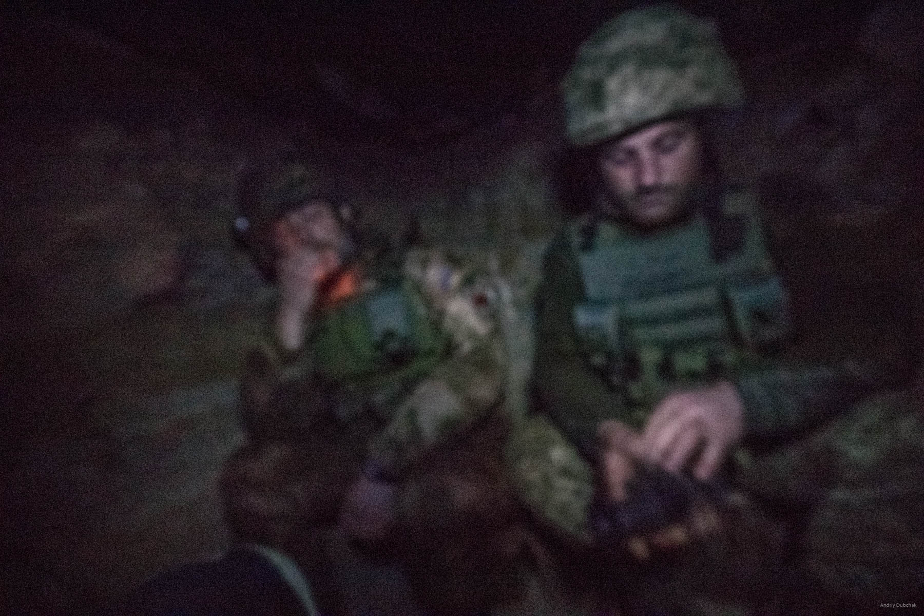In the darkness of a dugout near Bakhmut in December 2017, senior fighter "Didick" (right) shared with Dubchak the harrowing aftermath of losing one of his young soldiers. “When that mobile phone rings and you have to answer, and you can hear a female voice saying, ‘Hello! Hello! Sashku, Sashku, how are you? Hello! Why are you quiet?’ You stand there holding the dead soldier’s phone, not knowing how to begin. In those moments your voice shakes, your hands and feet tremble. You talk some nonsense, trying to express your apologies and sympathies. There would be silence on the other end. Then you would hear weeping and hysterics. That was the hardest thing,’” said Didick.