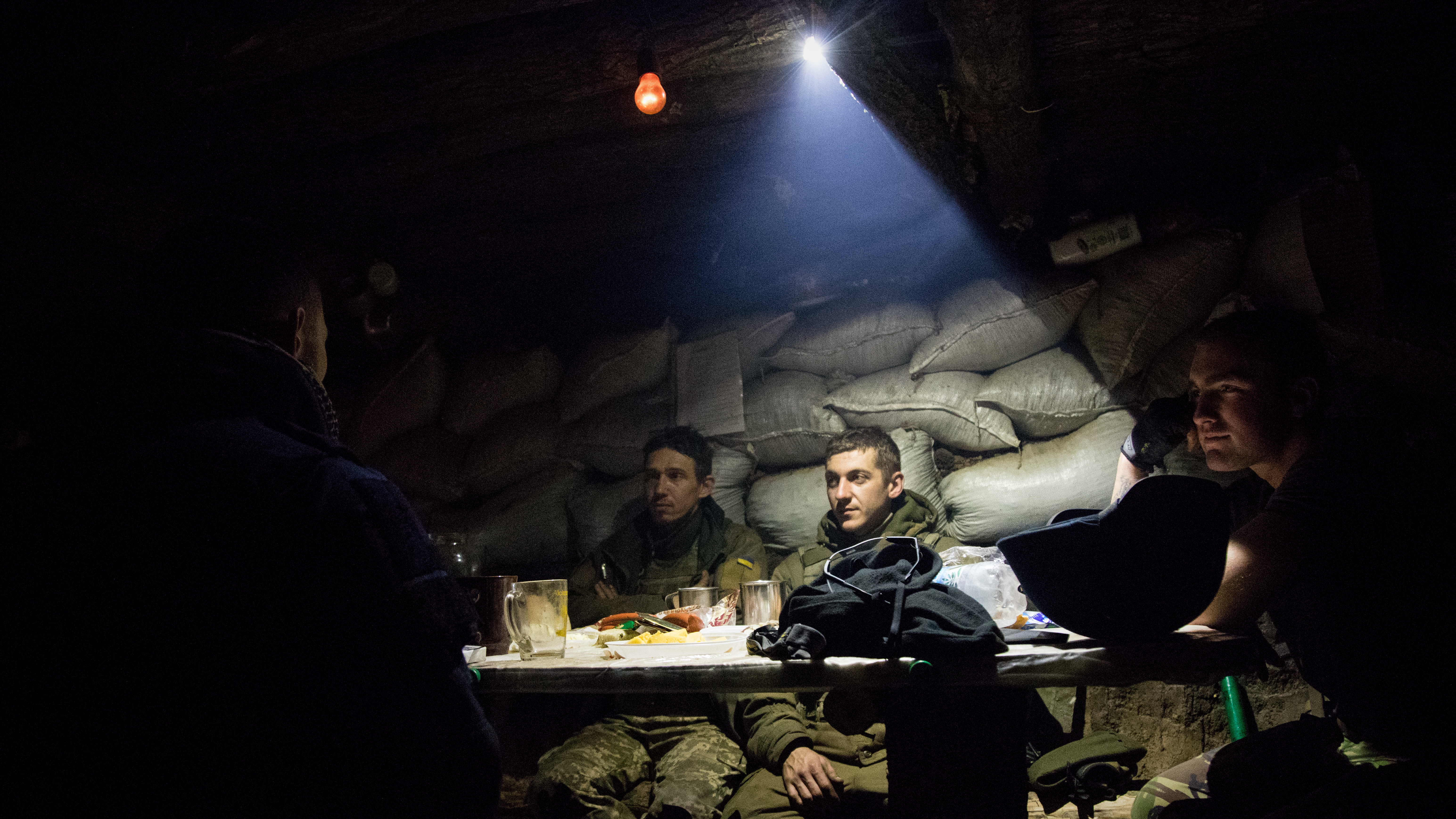 At a position near Bakhmut, Ukrainian soldiers eat dinner as their comrades-in-arms trade bursts of fire with Russia-backed separatists. Dubchak says his arrival at the outpost was discovered by the militants through radio chatter. That night, he and fellow RFE/RL photographer Maryan Kushnir lay pinned to the frozen soil outside as a series of tracer bullets blazed past within inches of the pair. In the darkness, Dubchak’s microphone recorded the near deadly incident.
