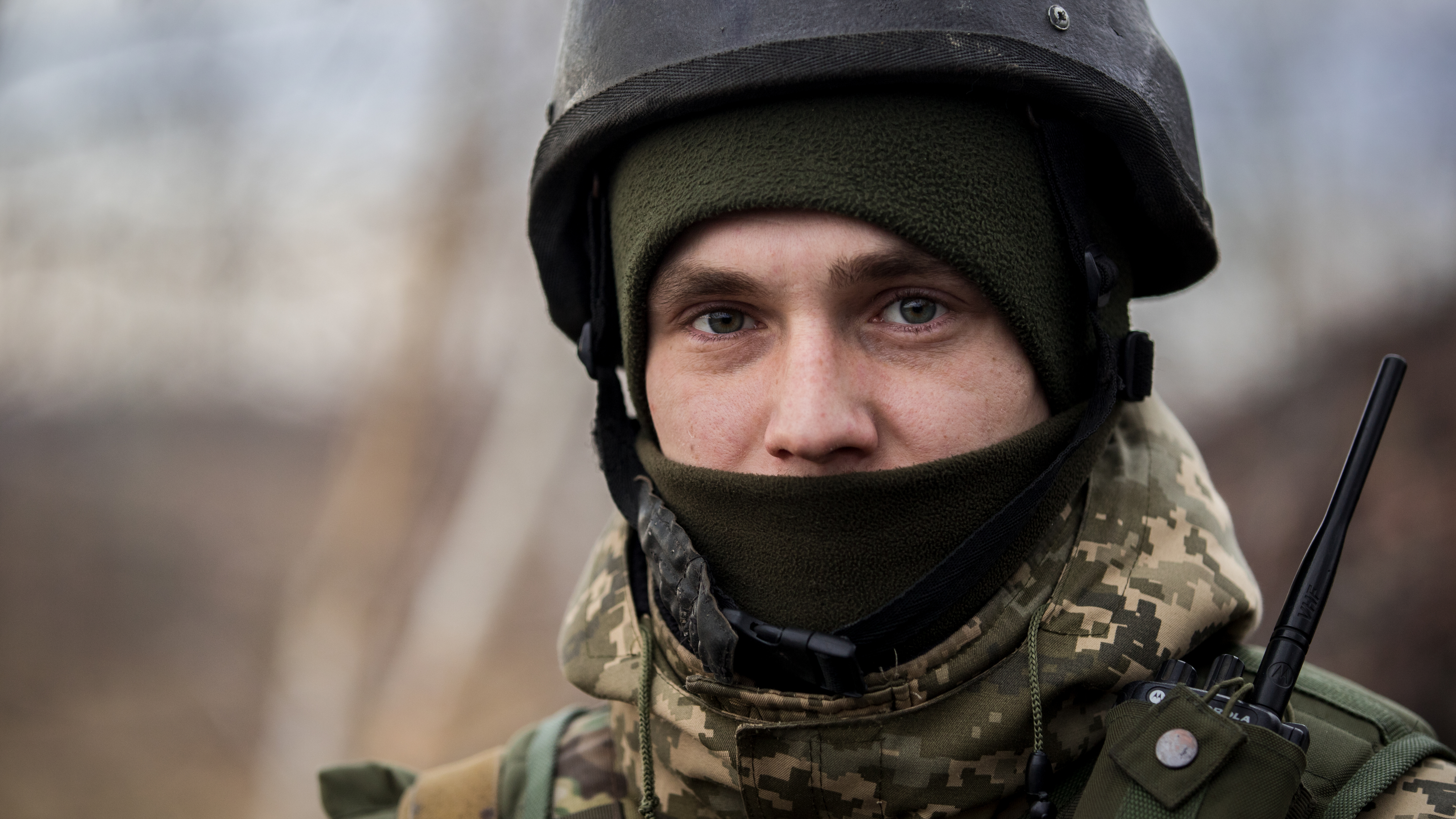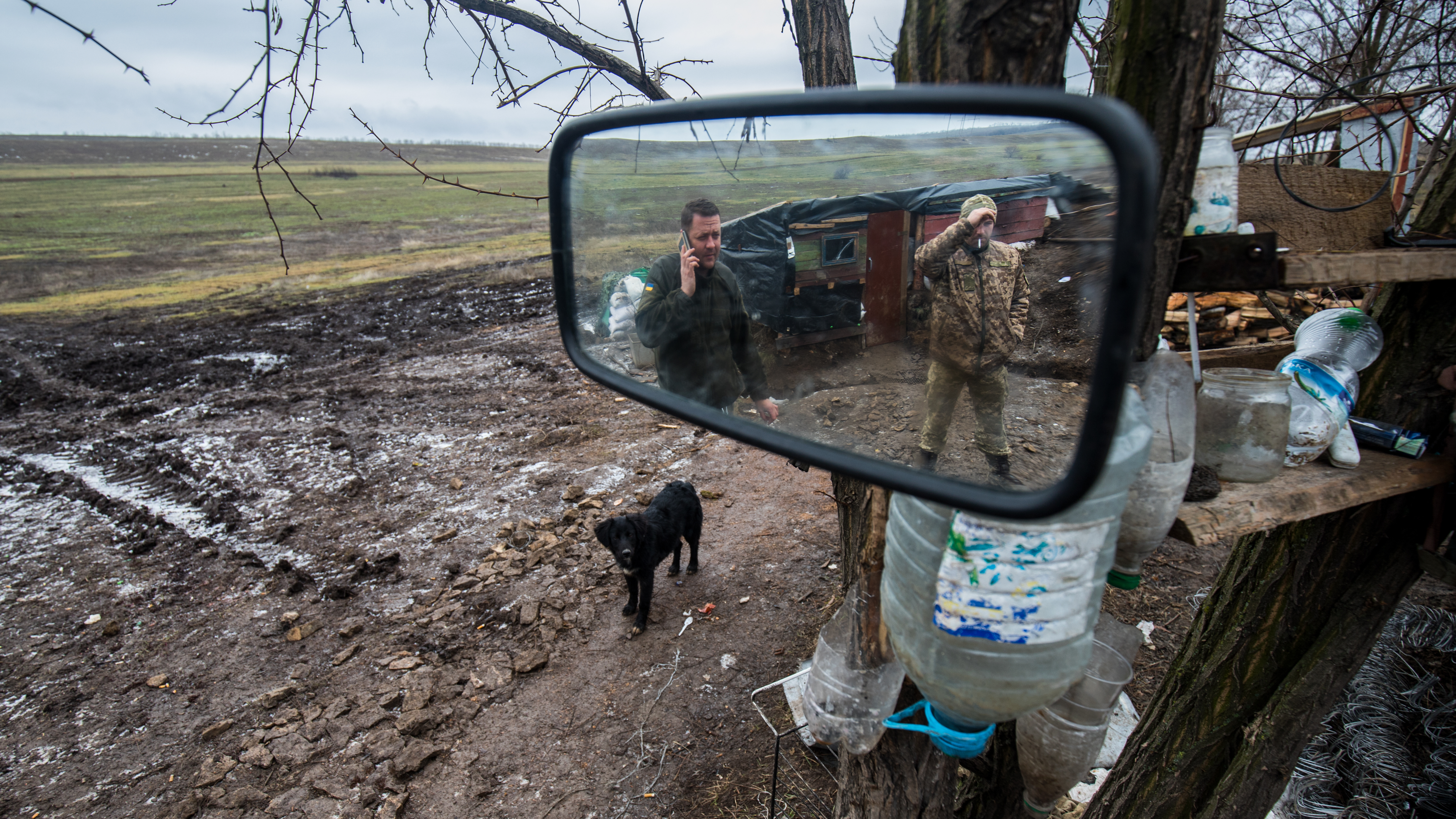 A soldier named Oleksandr at an outpost near the town of Zolotyy, in Ukraine’s Luhansk region. Moments after this picture was taken, as the 28-year old soldier laughed in conversation, Dubchak’s video captured the thwack of a sniper’s bullet impacting nearby. Then, a few days after Dubchak and fellow photographer Maryan Kushnir had returned to Kyiv, Oleksandr was struck in the head by another sniper’s bullet. The brain-damaged soldier is undergoing a lengthy rehabilitation in western Ukraine. Dubchak, who has since spoken to Oleksandr by phone, says his voice slowed to a drawl after the shooting but the soldier’s condition has been improving steadily. Oleksandr recently visited Western Europe after a crowdfunding campaign raised money for a holiday for the wounded young veteran.