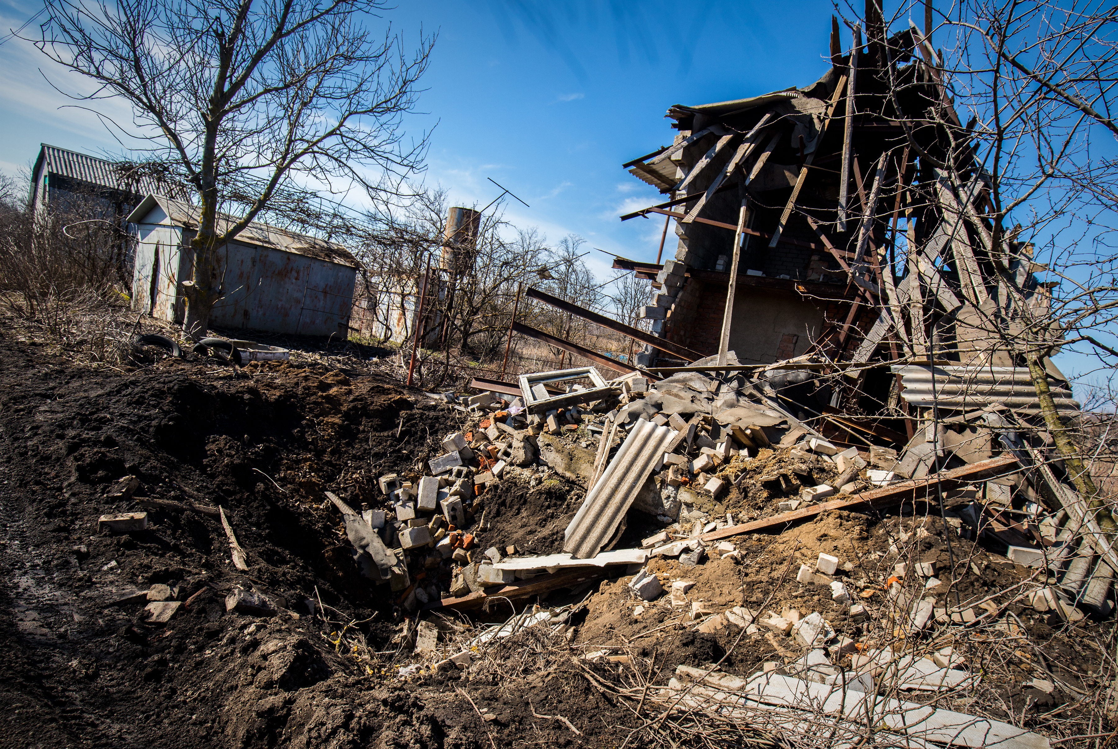 The wreckage of a house in the village of Vodyane, wiped out by separatists probably firing a 152mm howitzer in March 2018. Dubchak says in places like this, when he could hear the shells from heavy artillery screaming overhead, “You can feel death is close. If you’re honest with yourself you know you can die, but at the same time there’s a little hopeful voice telling you not to believe it. It’s like a fight going on inside your mind -- hope and reality wrestling with each other.”