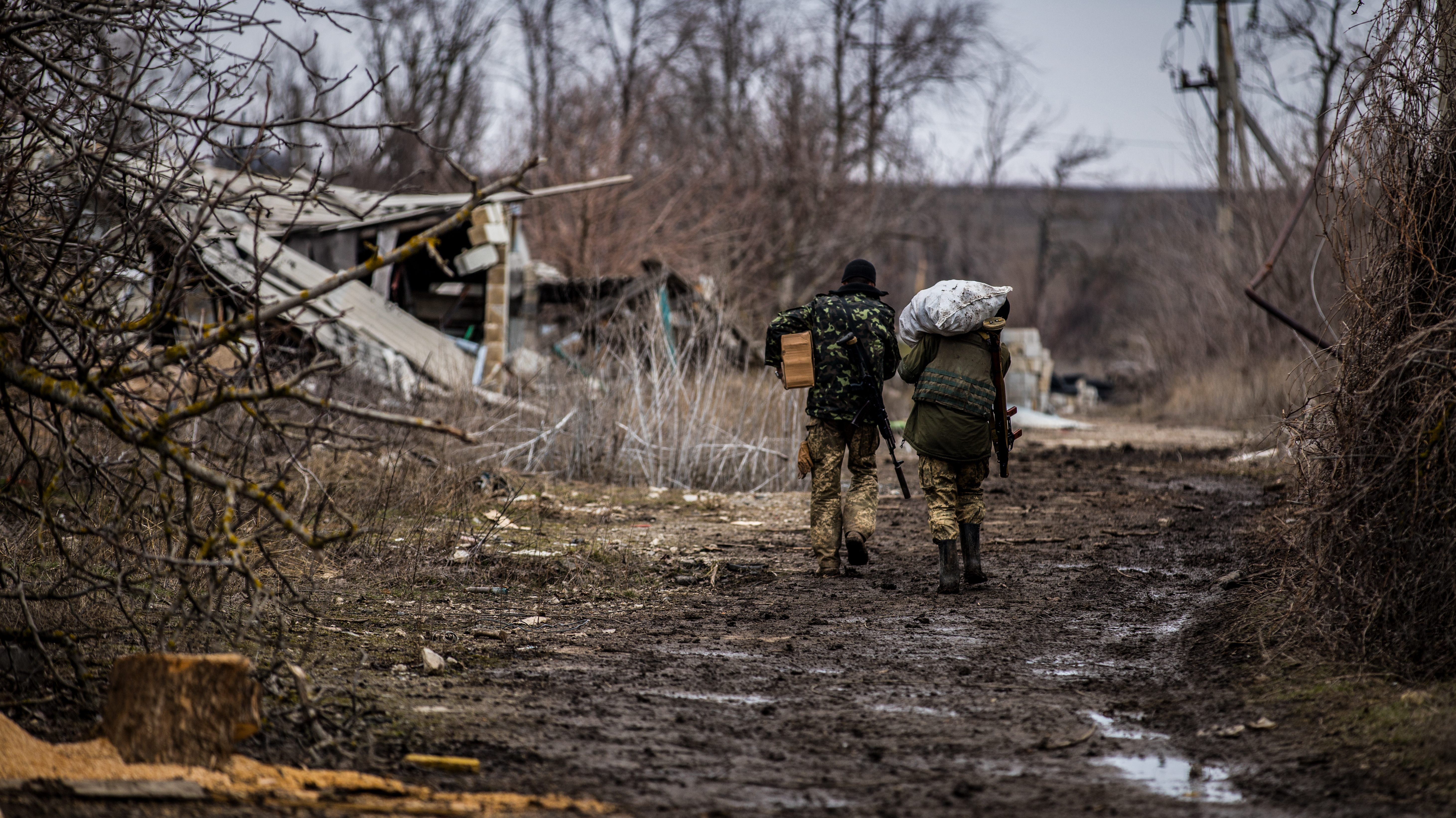 Ukrainian marines carry potatoes and other food toward a frontline position. After his extensive experience covering the conflict, Dubchak says: “War is not only shooting and explosions, it’s also cabbage, beets, and condensed milk, a filthy uniform and socks, dreams of a bath. It’s cucumbers, meat, batteries, 1.5 liters of water a day, timber, shovels, digging trenches and digging again, around-the-clock digging. War is a constant manhandling of some thing to some place. It’s soaked boots, amplifiers for WiFi, bread, fuel, and a missing spanner. War is an overdue parcel at the post office, and a pot too small to feed everyone borscht. It’s firewood, then more firewood, and again firewood. Trench warfare is at least 90 percent logistics.”