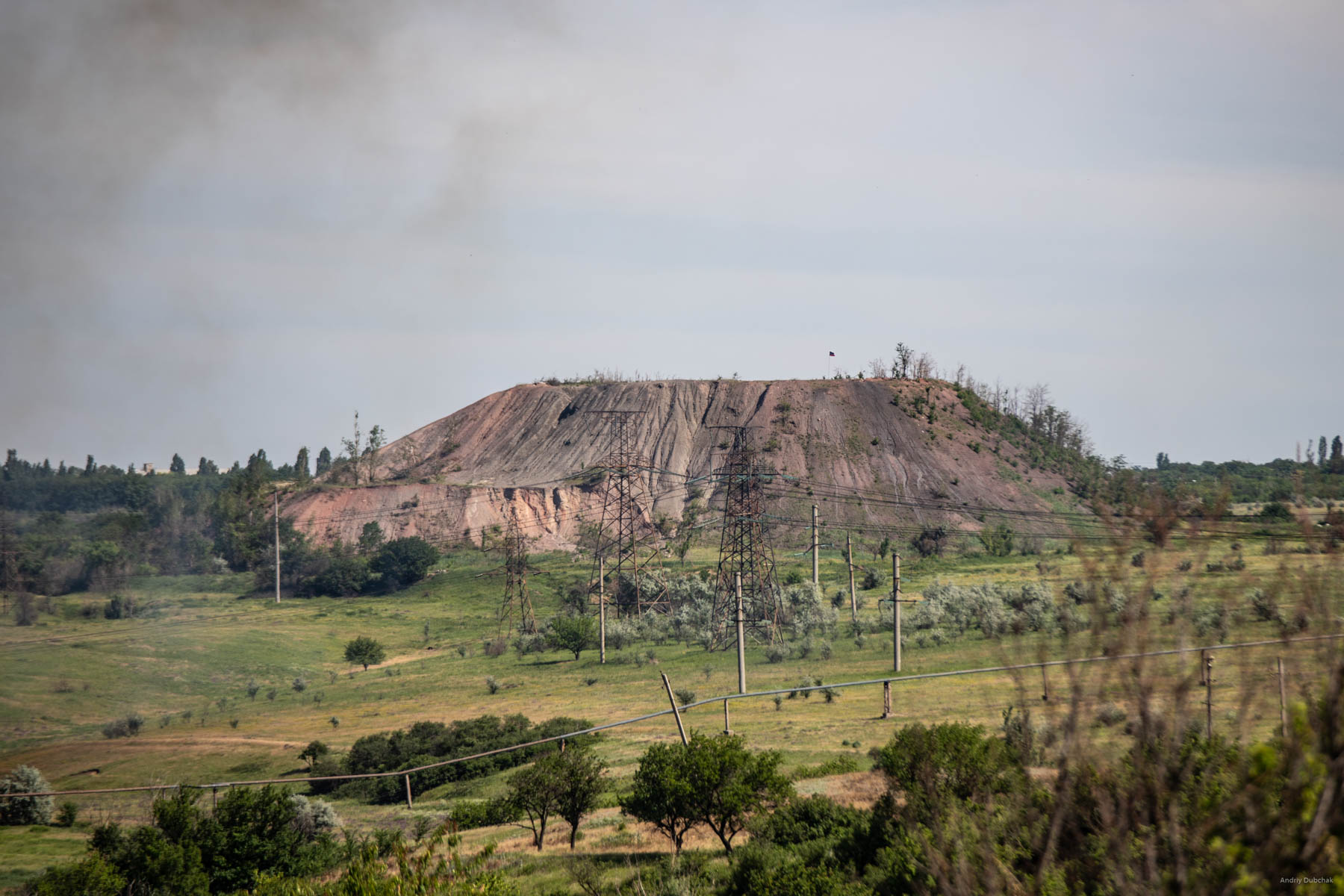 The smoke from burning houses drifts above a mine’s slag heap. On the summit, the flag of the Russia-backed separatists can be seen, where gun placements hold a commanding view of the battleground.