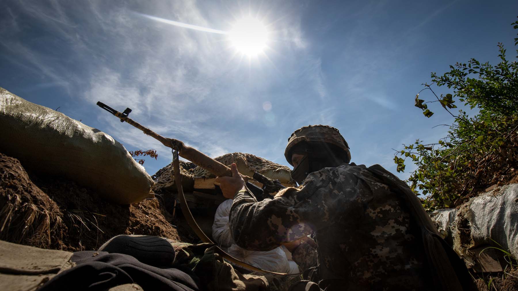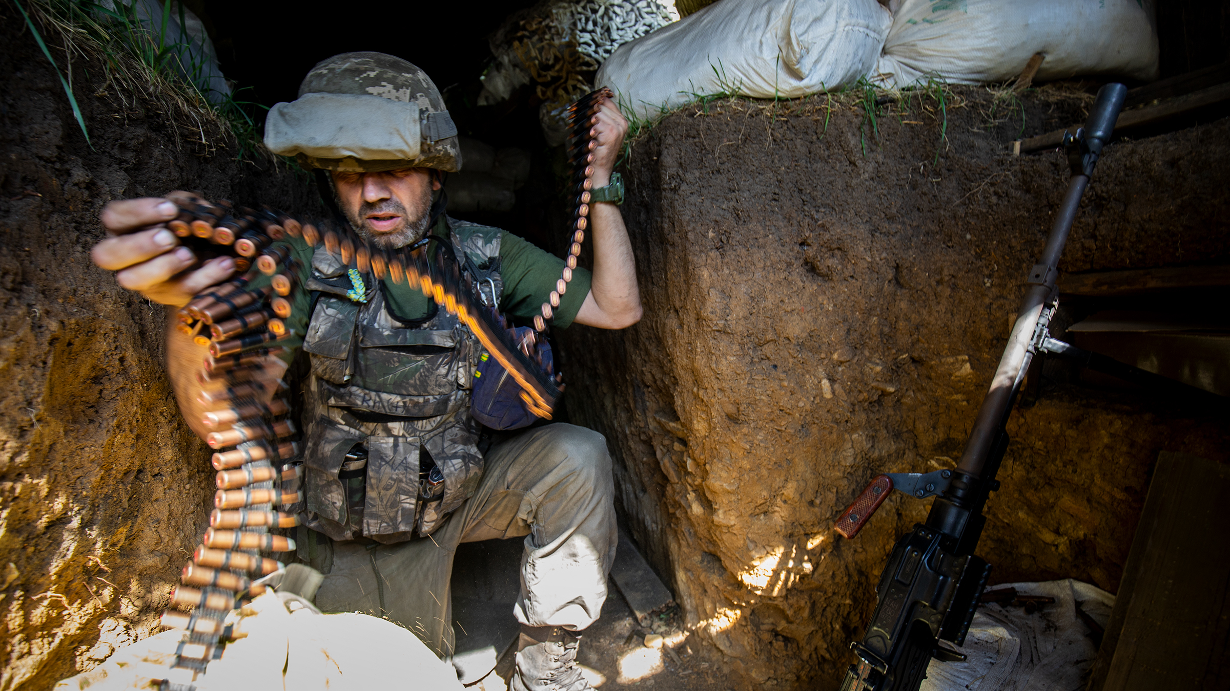 During a firefight near Horlivka in June 2018, as bullets “buzz and squeal” overhead, a soldier races to replace a belt of machine-gun bullets.
