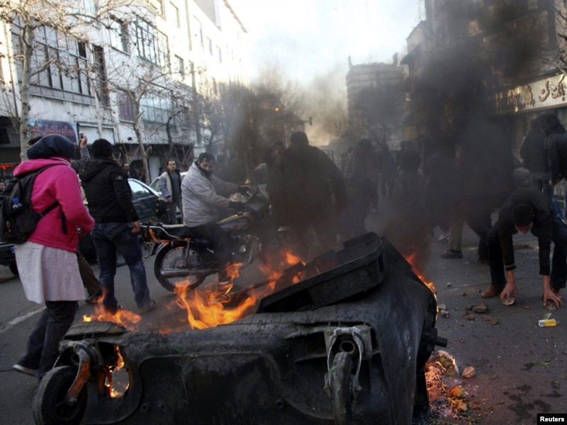 A dumpster burns on a street during clashes between protesters and police near Azadi Square in Tehran.