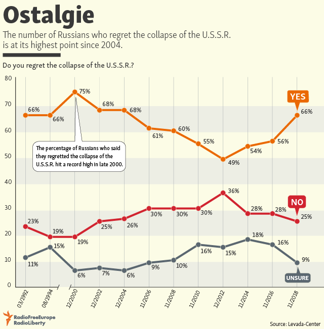 The number of Russians who regret the collapse of the U.S.S.R. is at its highest point since 2004.