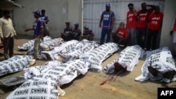 Volunteers gather beside the dead bodies of blast victims outside a hospital following a bomb explosion in Karachi today that killed 11: