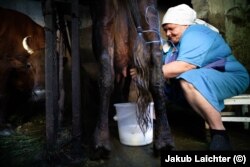 Tetyana, 62, in her field with one of her surviving cows.