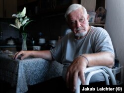 Tetyana, 62, in her field with one of her surviving cows. Photo: Jakub Laichter (©)