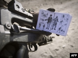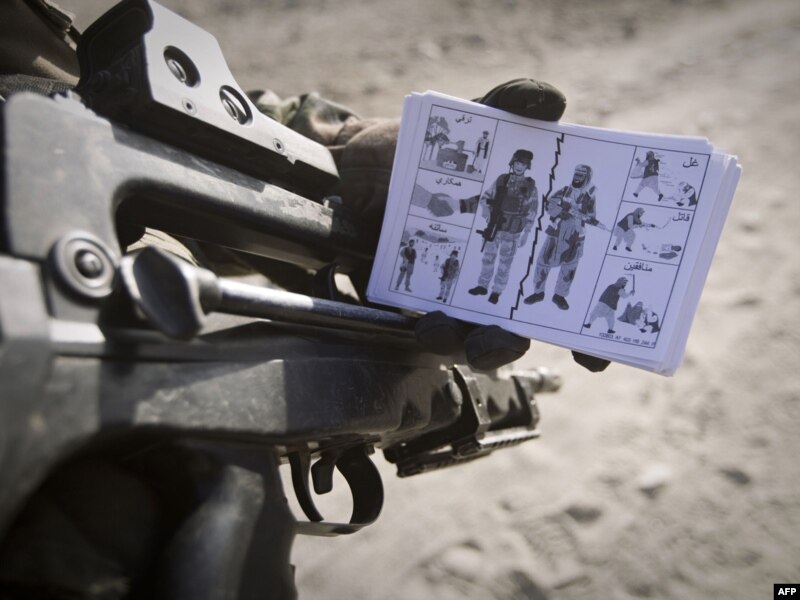 A French soldier holds up leaflets to be distributed to local villagers showing the difference between ISAF soldiers and insurgents, during a patrol near Tagab in Kapisa Province, Afghanistan, in January.