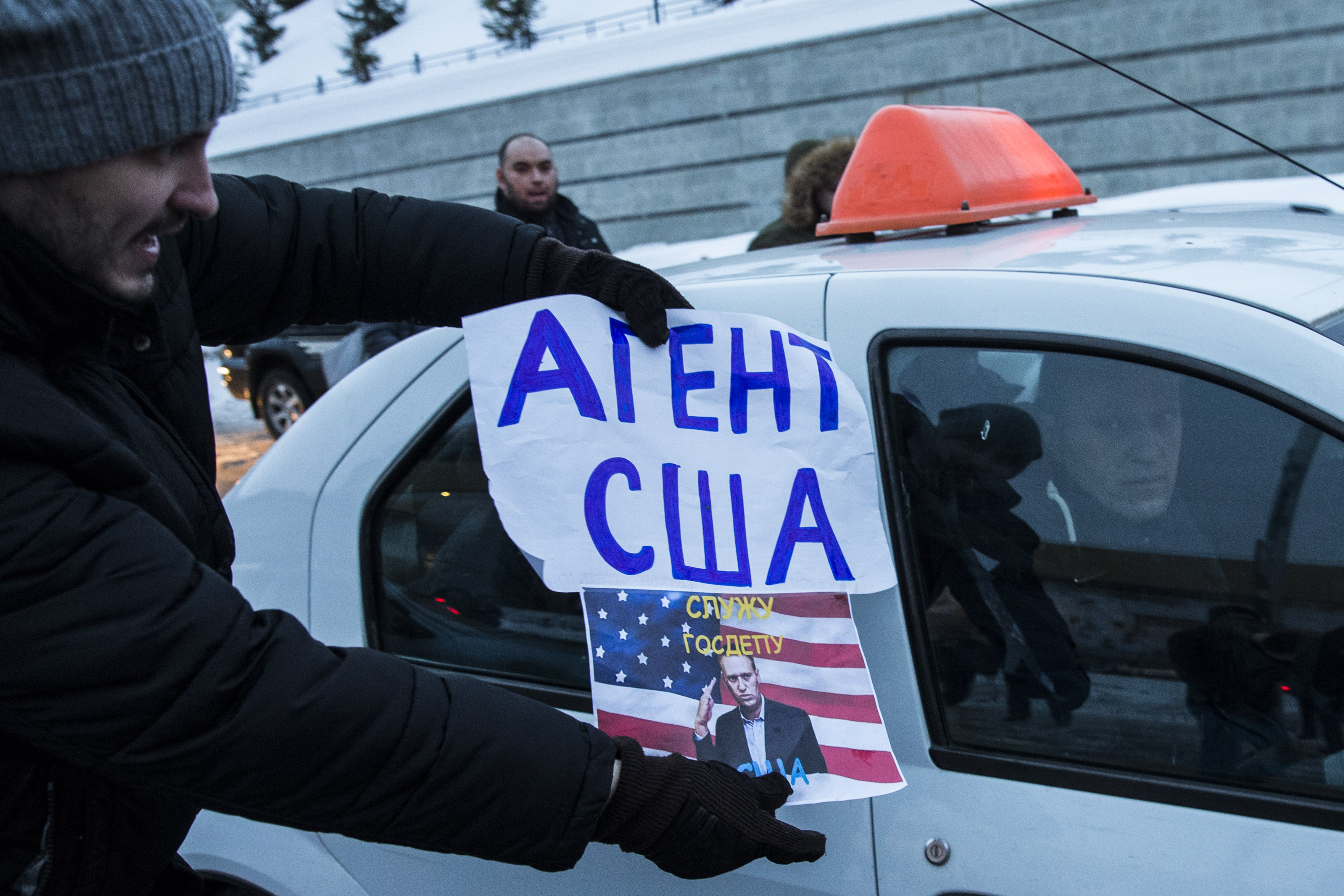 A man planting a sign that reads "American agent" next to Navalny's departing taxi in Ufa on March 4. Moments earlier, Navalny and his supporters had been attacked with eggs.