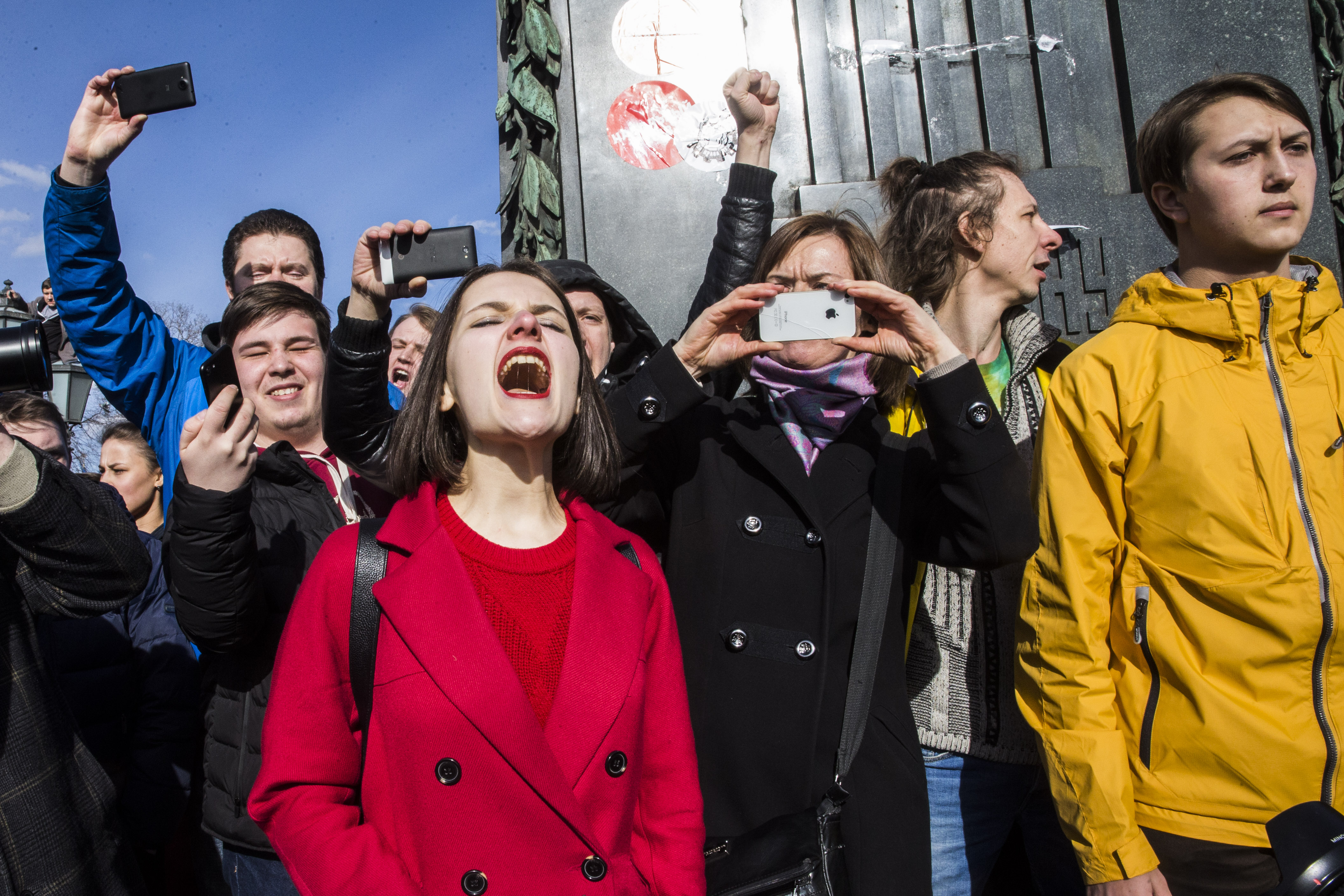 Young protesters shouting anti-corruption slogans during protests on March 26. The Moscow protests followed a video released by Navalny that alleged massive corruption by Prime Minister Dmitry Medvedev.