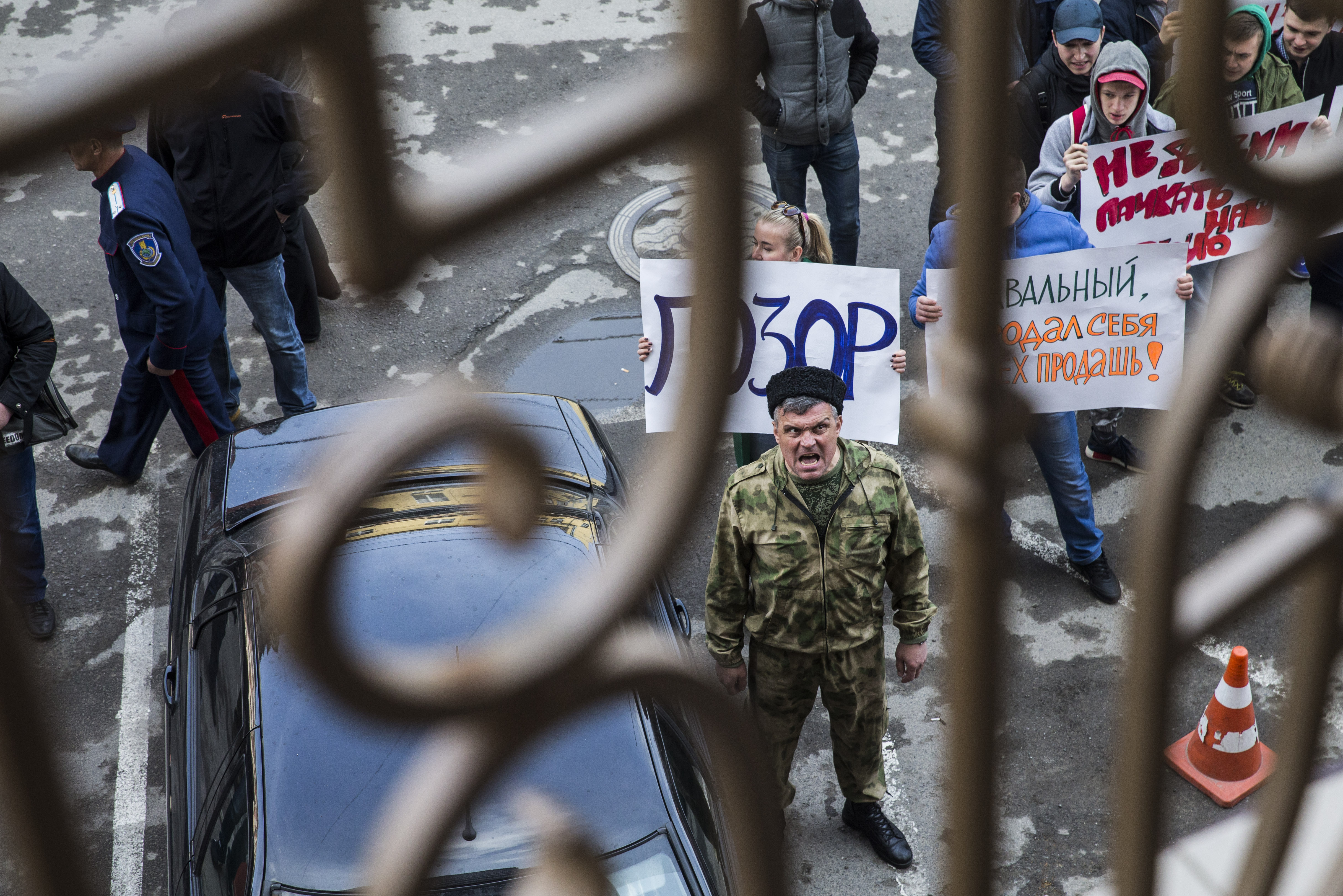 A Cossack bawling insults in Rostov-on-Don in April. Feldman told RFE/RL that hostility to Navalny's team reached such a pitch in the early days of the presidential campaign that "for two months...every trip the campaign made across Russia, we had some attacks."