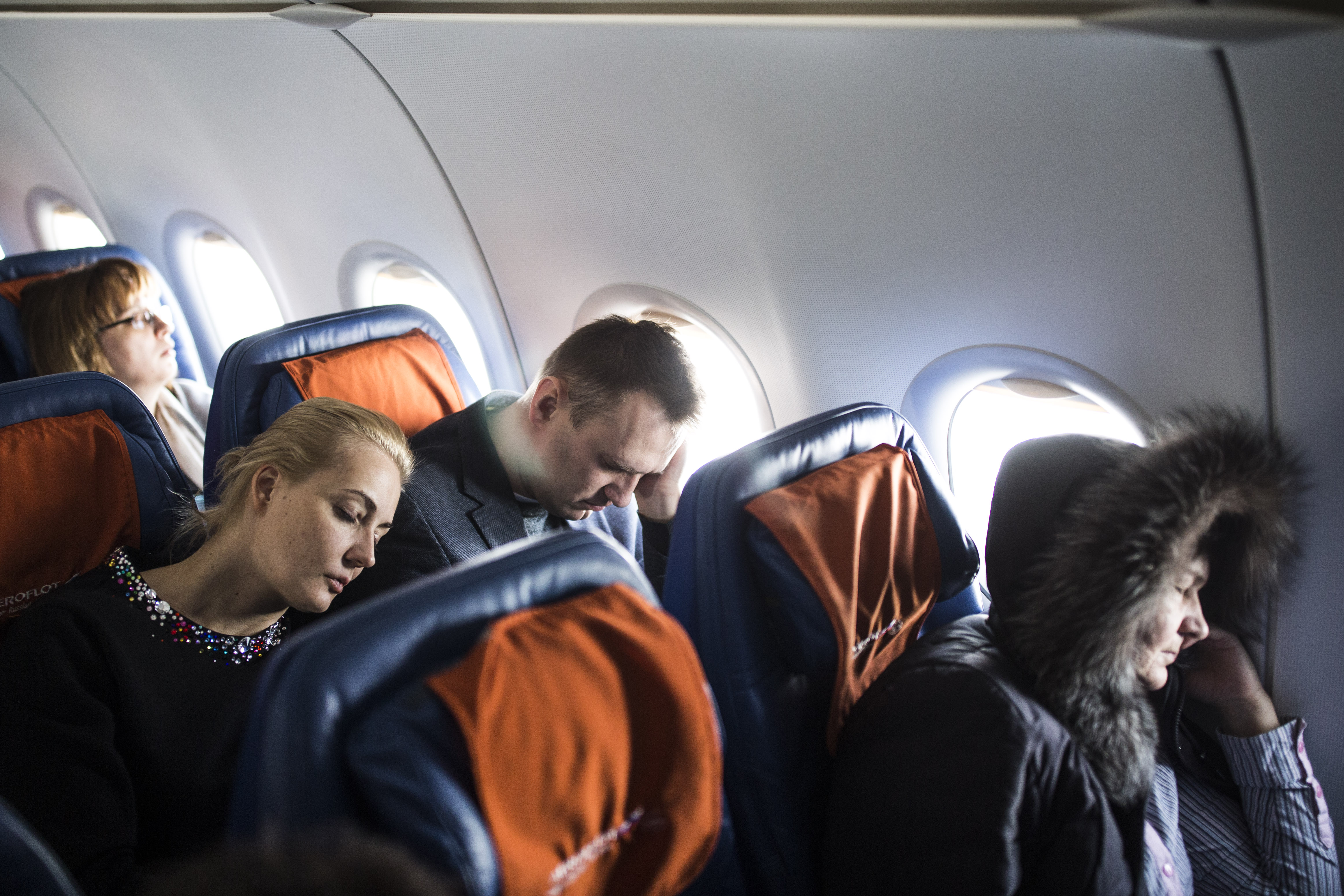 Navalny reading during a flight to Yekaterinburg as his wife, Yulia, dozes. A few weeks before this February 24 picture was taken, after a conviction that he calls politically motivated, the anti-corruption campaigner had announced his intention to run for president.