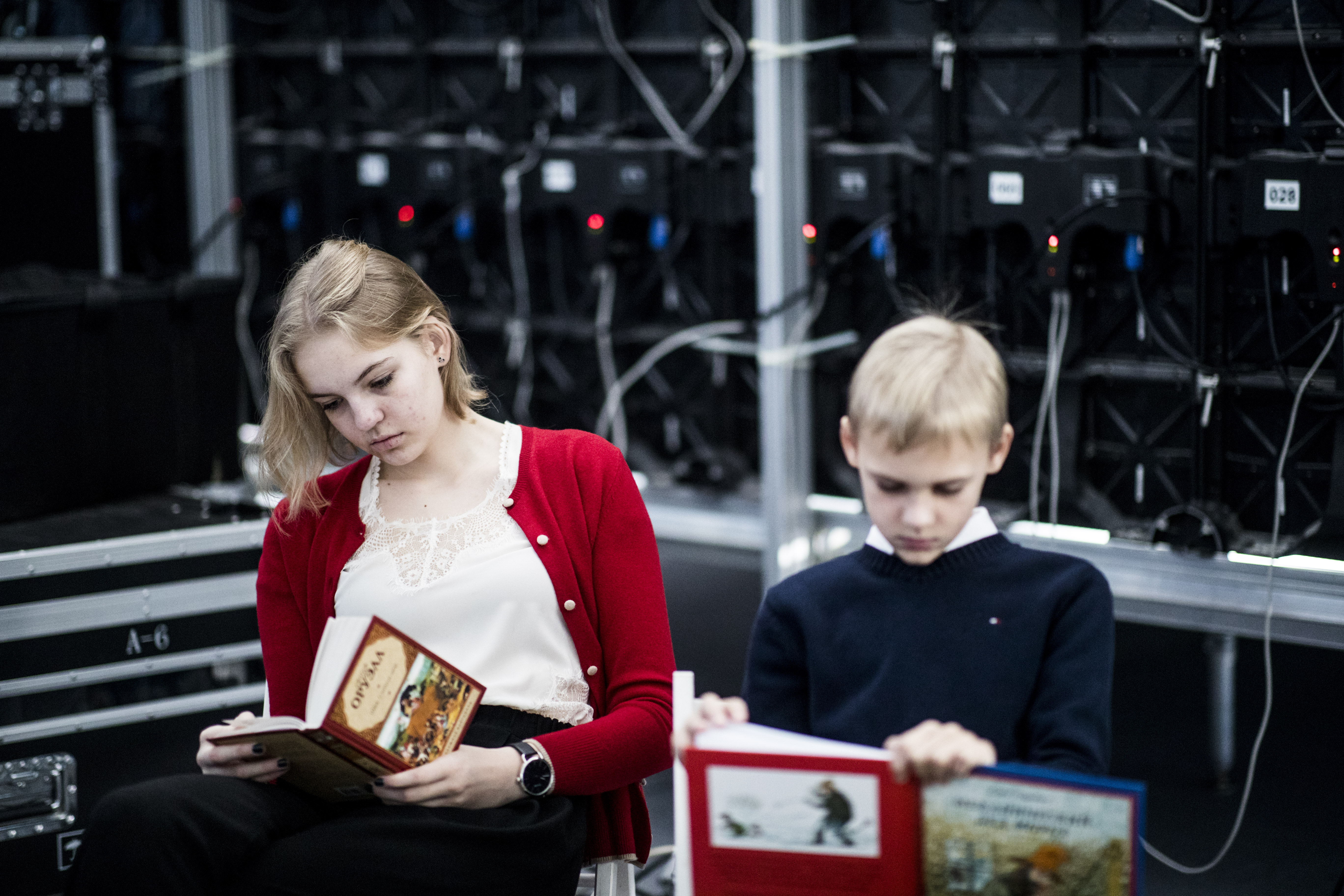 Navalny's children waiting backstage at a meeting of supporters in Moscow. Navalny's daughter is reading George Orwell's 1984.