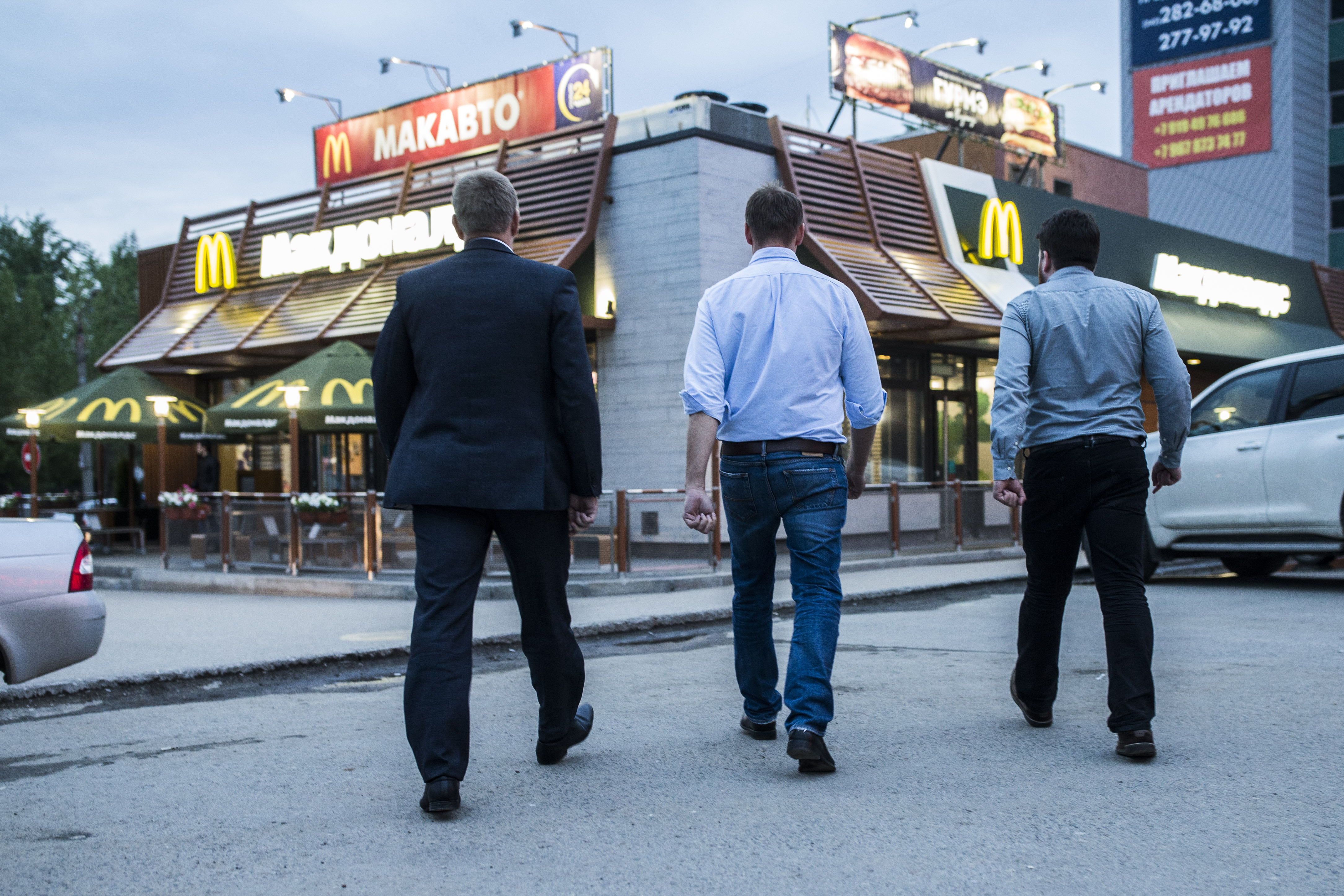 Navalny (center) and campaign staff head to McDonald's for dinner.
