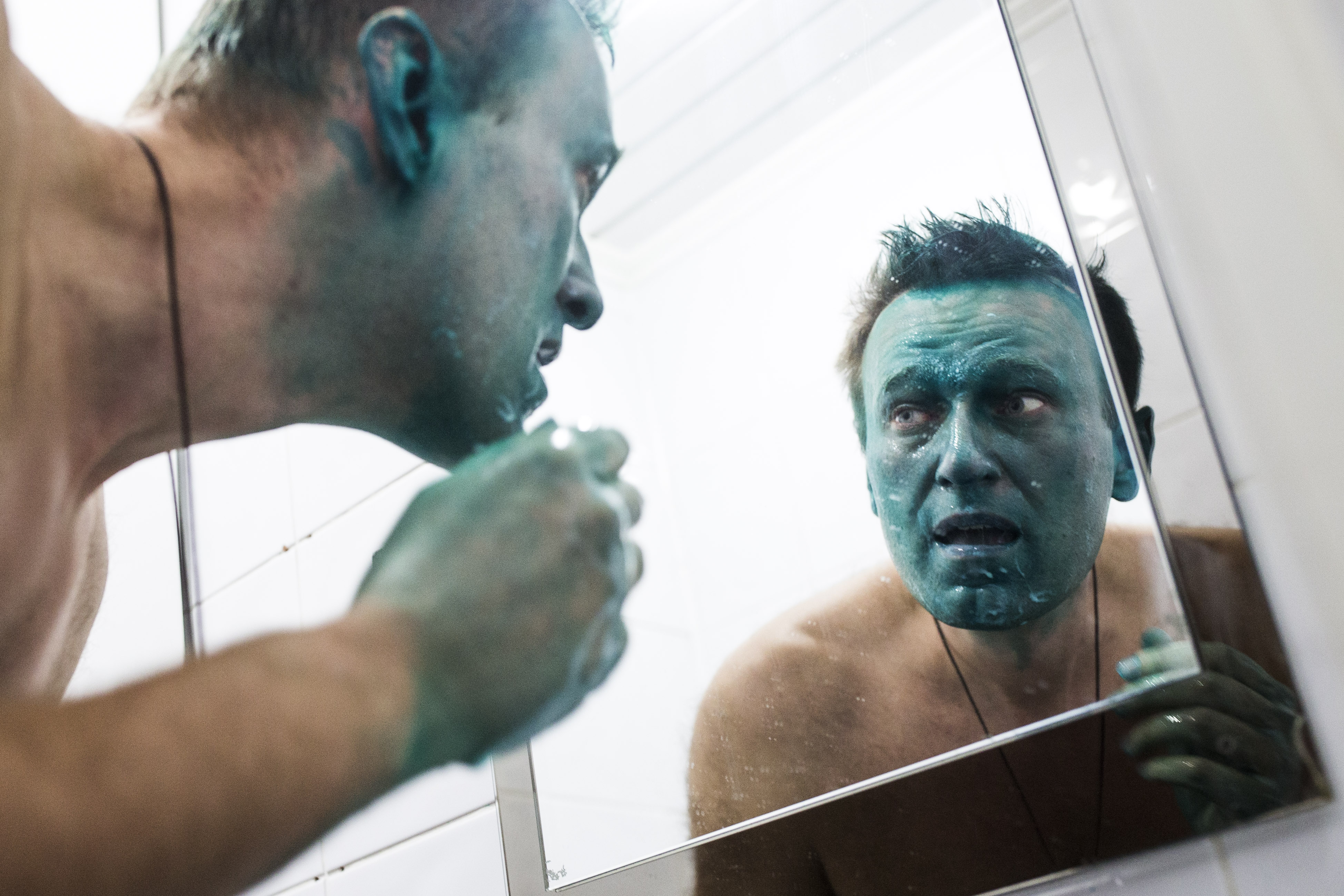Navalny after being sprayed in the face with green antiseptic known as "zelyonka" in Barnaul on March 20. Feldman says Navalny was "angry at first, then switched to a 'f*** you, I’m still smiling' mode to show such attacks were pointless. But the liquid was burning his eye, so he was actually quite scared."