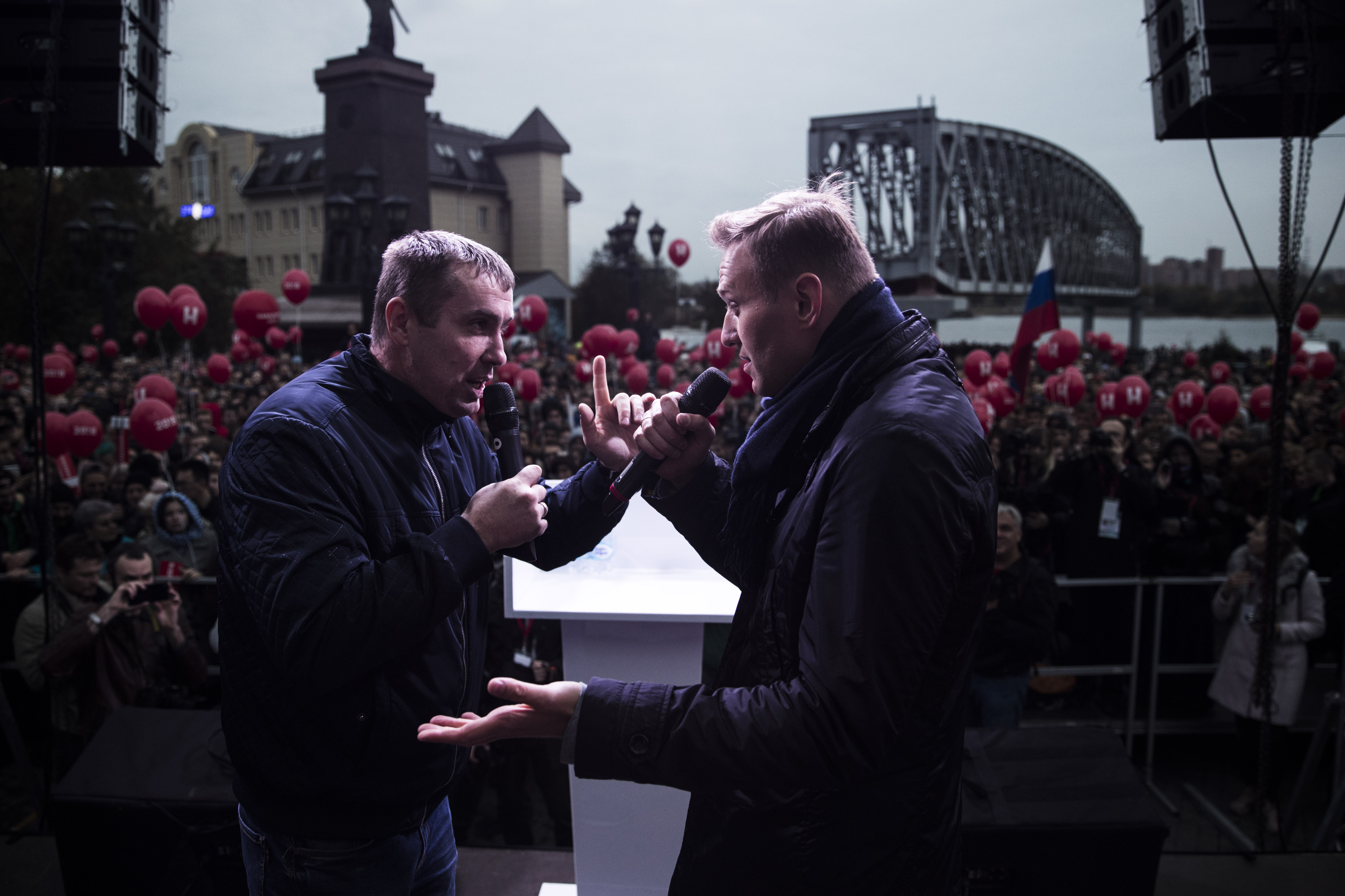 At a rally in Novosibirsk, Navalny debating a man who had been heckling him from the crowd.