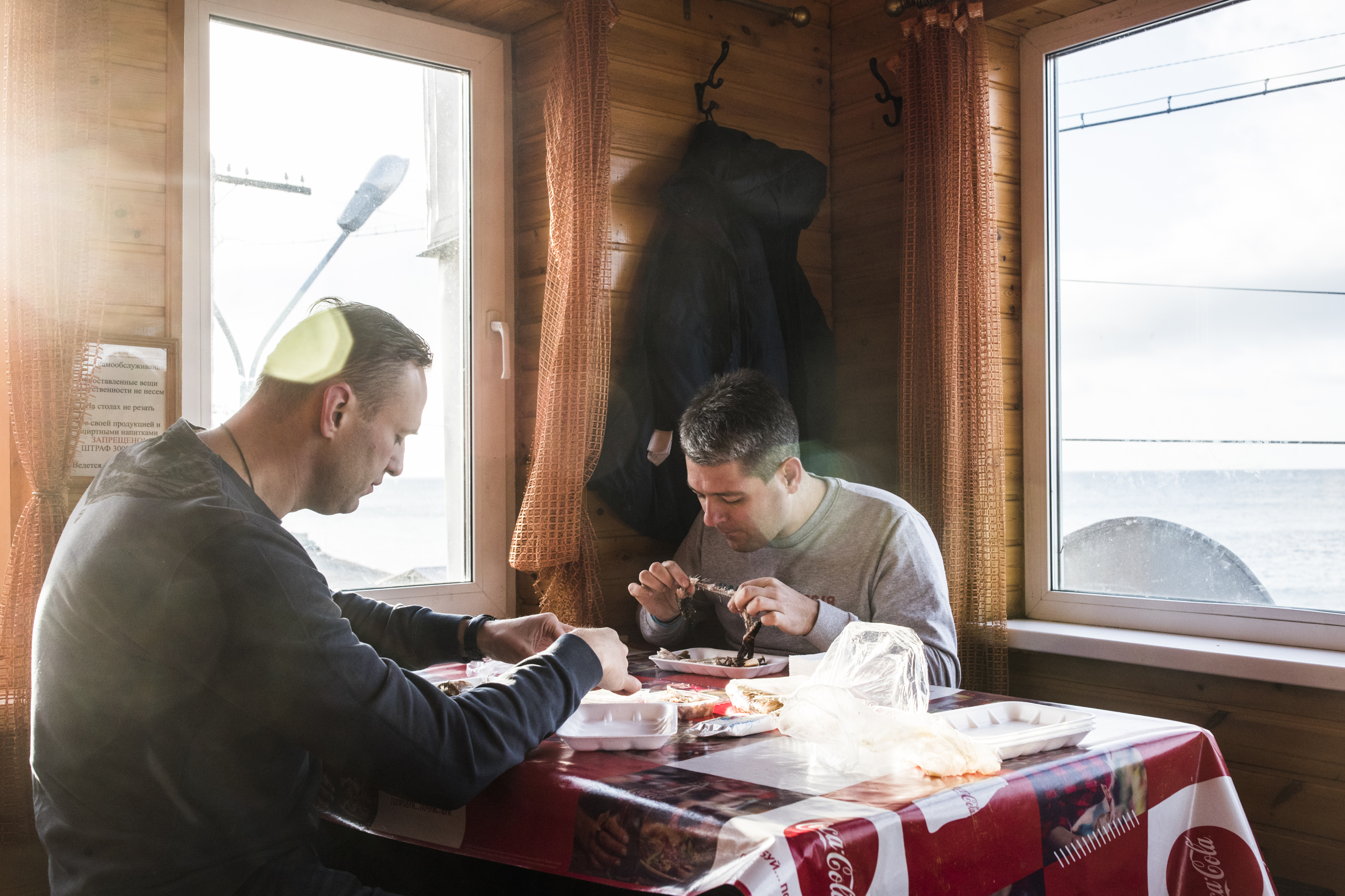 Navalny and a local campaign supporter picking through a meal of fine-boned fish next to Lake Baikal.