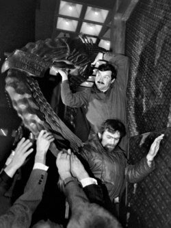 A banner of the ancient Lithuanian emblem known as Vytis being hung inside parliament to replace the Soviet hammer and sickle.